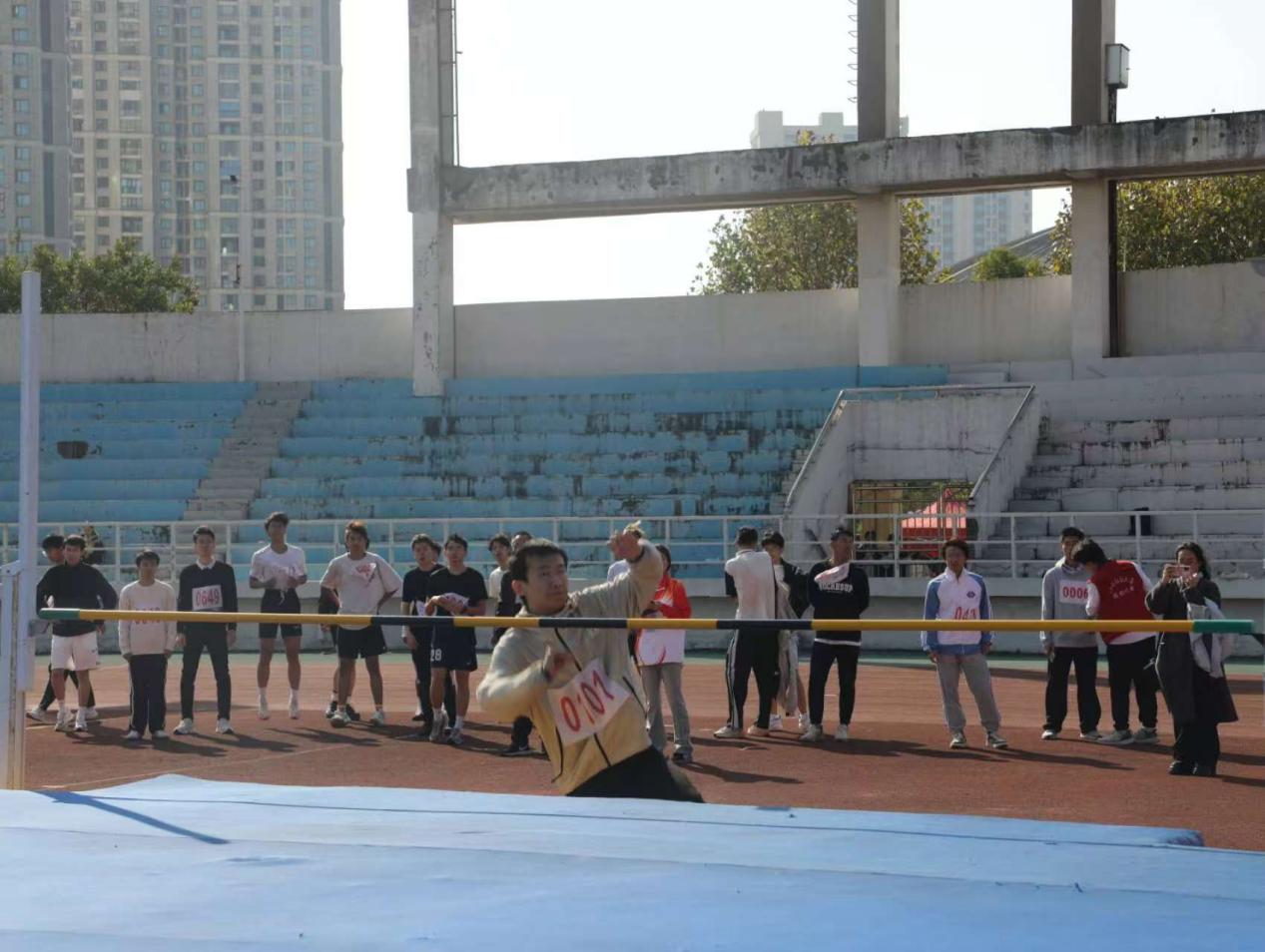 田赛场的比拼同样精彩纷呈。跳高场地上,运动员助跑、起跳、腾空、过杆,身姿轻盈如燕,引来阵阵喝彩;跳远沙坑旁,一道身影助跑后奋力蹬踏,在空中划出优美的弧线,稳稳落向沙坑,激起一片沙浪。