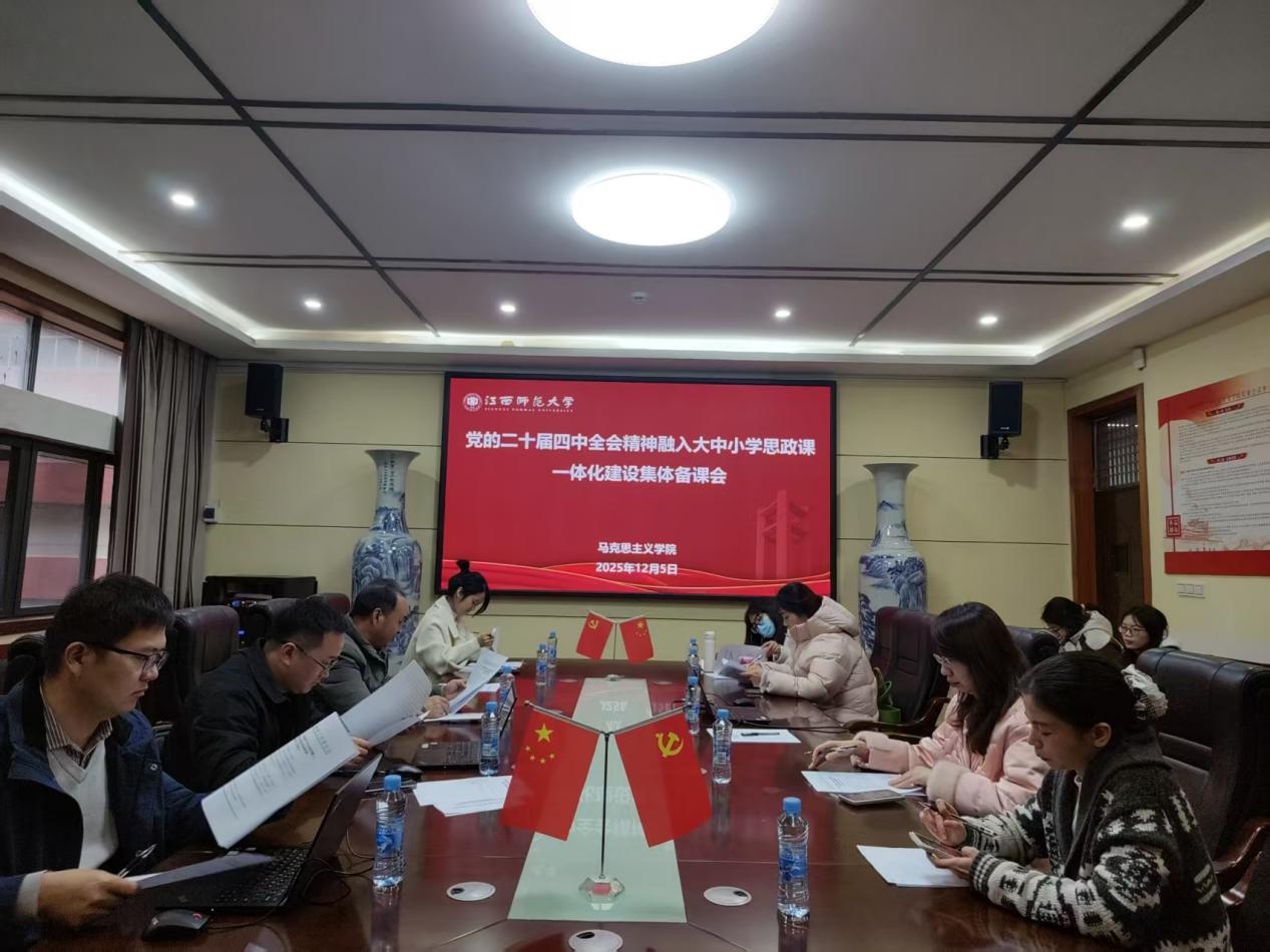 为深入推进党的二十届四中全会精神融入思政课程建设,探索大中小学思政课一体化教学路径,马克思主义学院于2025年12月5日下午在2317会议室组织召开集体备课会。会议由学院副院长彭坚主持,来自学院公共课课程的教师代表,以及南昌市育新学校李丽副校长带领部分中小学思政课教师共同参会,围绕全会精神与思政课教学的有机融合展开深入研讨。