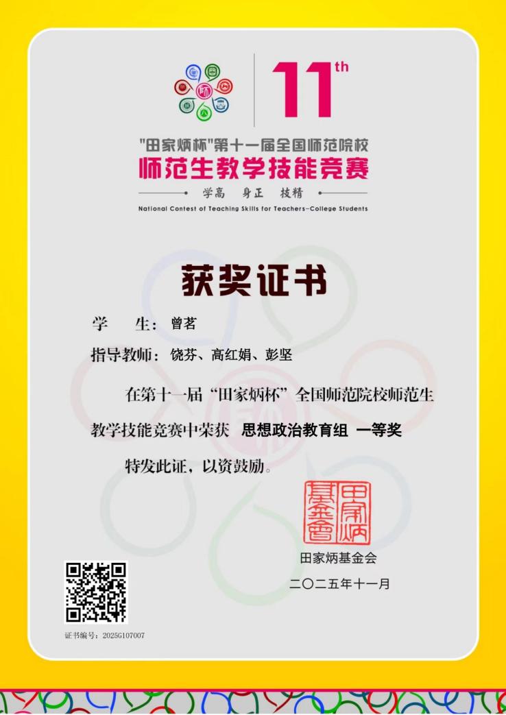 近日,第十一届“田家炳杯”全国师范院校师范生教学技能竞赛决赛在浙江师范大学圆满落幕。我院2023级思想政治教育专业本科生曾茗凭借扎实的专业功底和出色的教学表现,经过初赛和决赛环节,力挫群雄,斩获全国一等奖,为学院学生参加本项赛事以来取得的最好成绩,展现了我院师范生培养的扎实成效。“田家炳杯”全国师范院校师范生教学技能竞赛是我国师范教育领域规模最大、层次最高、影响力最广的多学科综合性赛事之一,属于学校的A2类比赛。本届比赛共有全国289所高校的2345名选手参加。