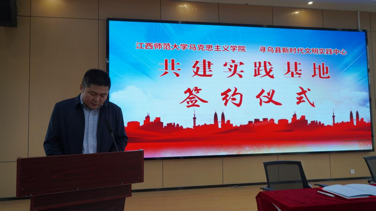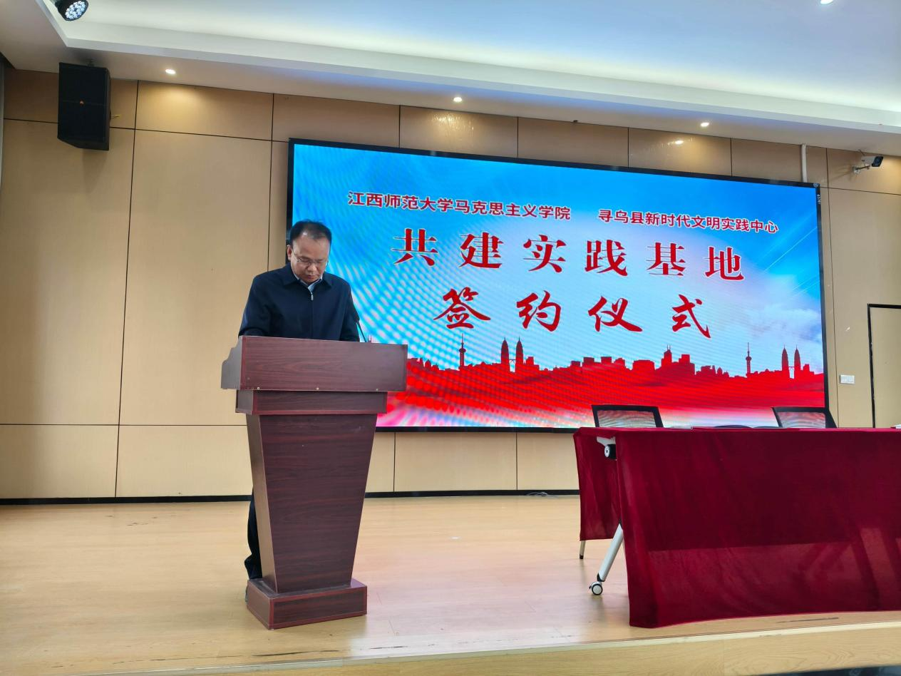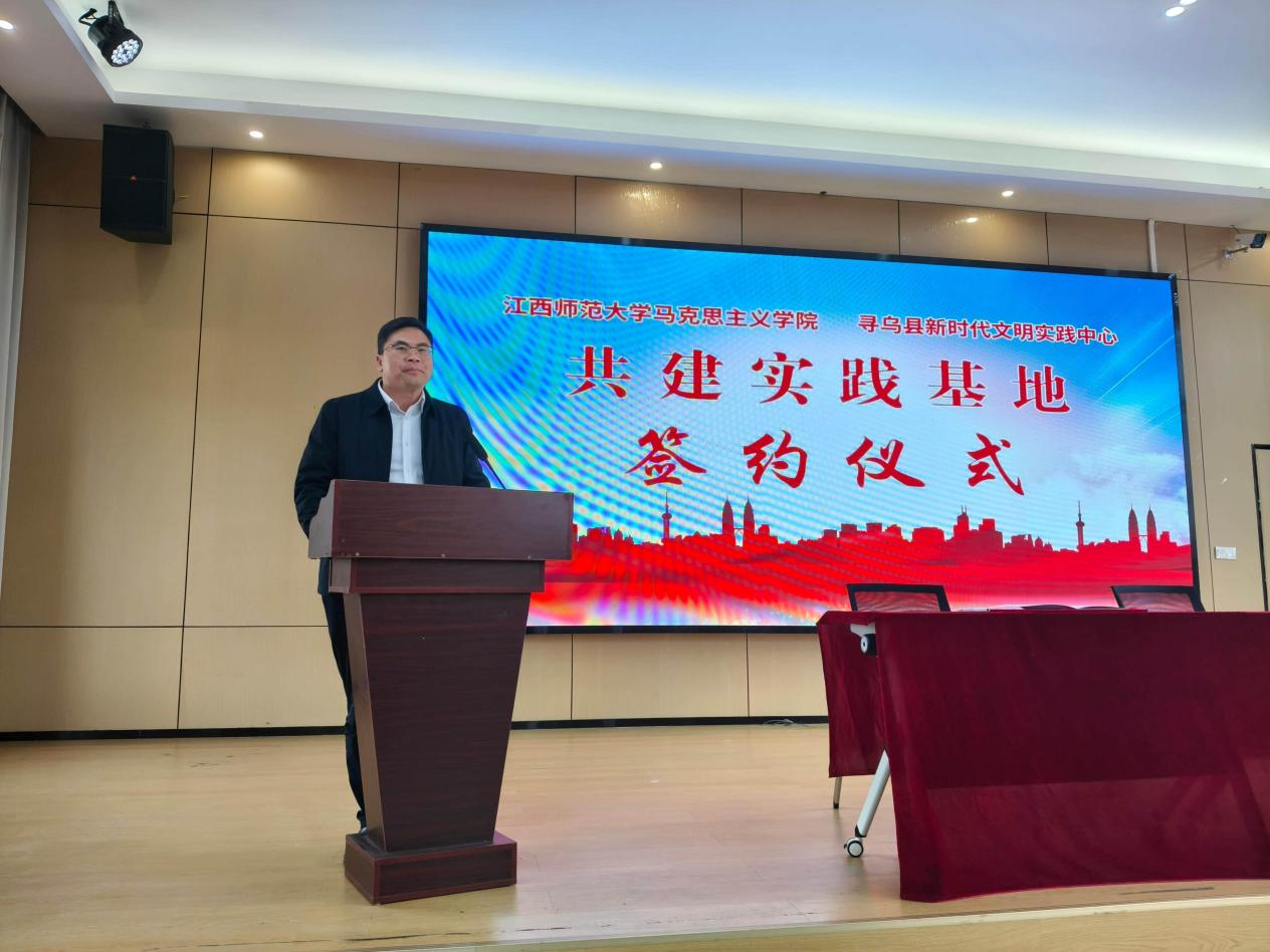 杨卫军副校长在致辞强调,寻乌是毛泽东同志开展著名“寻乌调查”的地方,“没有调查,没有发言权”的唯实求真精神在这里发源,这与马克思主义实践观和实事求是的思想路线高度契合。他指出,江西师范大学马克思主义学院拥有深厚的学术底蕴和人才优势,此次共建是贯彻落实上级关于高校马院与新时代文明实践中心结对共建要求的具体行动,也是高校服务社会、深化实践育人的重要途径。学院将充分发挥智力优势,推动党的创新理论在寻乌大地落地生根,推动文明实践工作在寻乌落地见效,同时从寻乌丰富的实践沃土中汲取养分,反哺教学与研究。
