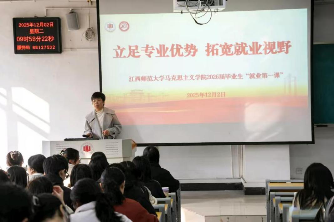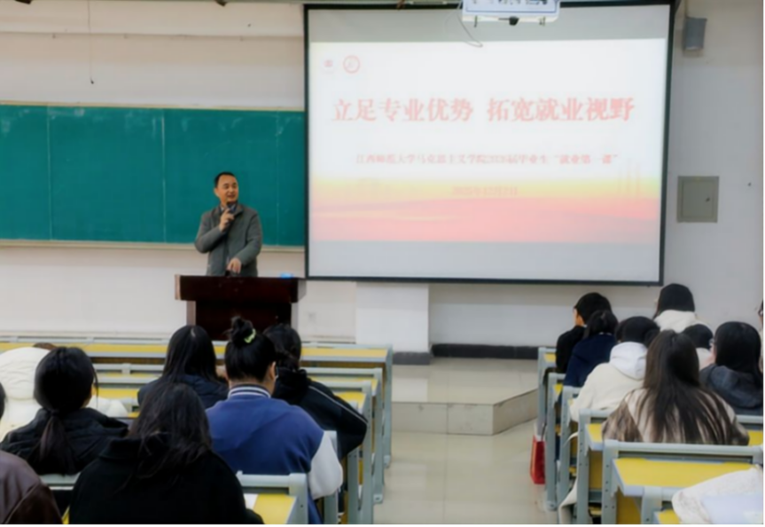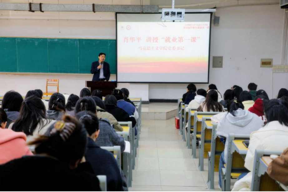 冬暖传情护远航,师心聚力促就业。为传递学院领导对毕业生就业工作的殷切关怀,切实将育人温度融入就业指导全过程,助力毕业生在寒冬中明晰职业路径、坚定就业信心,2025年12月2日上午10时,马克思主义学院于W7302教室,开展了“立足专业优势,拓宽就业视野”2026届毕业生“就业第一课”。院党委书记肖华平,副院长彭坚、党委副书记周礼芳,学工办副主任赵灵飞等与2026届全体毕业生齐聚一堂。本次活动由院党委副书记周礼芳主持。