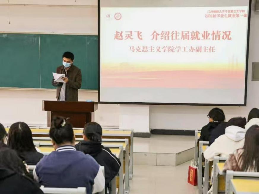 学工办副主任赵灵飞则围绕往届毕业生就业情况,为在场学子开展了针对性指导。他依托往届就业数据,客观剖析了当前就业市场的竞争态势,通过真实案例展现了多元发展路径的可行性。朴实的话语里传递出对毕业生的真切关怀,也为同学们后续优化职业规划提供了清晰思路。