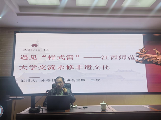 为贯彻落实《江西师范大学和新时代文明实践中心共建行动计划实施方案》的相关要求,12月17日上午,九江市非遗传承人、永修县作家协会主席张欣老师应邀走进课堂,以《遇见“样式雷”》为主题为同学们呈现了一场精彩纷呈的文化盛宴。任课教师张业振主持分享会。