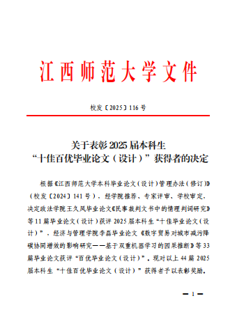 近日,学校发布《关于表彰2025届本科生“十佳百优毕业论文(设计)”获得者的决定》,经学院推荐、专家评审、学校审定,共评选出11篇“十佳毕业论文(设计)”、33篇“百优毕业论文(设计)”。