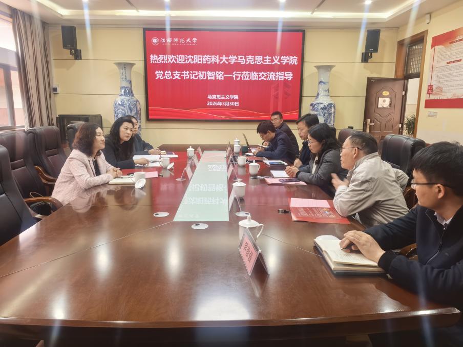 2026年3月30日,沈阳药科大学马克思主义学院党总支书记初智铭、主持行政工作副院长郭赞、副院长宋雪等一行莅临江西师范大学马克思主义学院开展调研交流。马克思主义学院党委书记肖华平、院长尤琳及院领导班子成员、江西师范大学期刊社总编戴利朝出席座谈会。